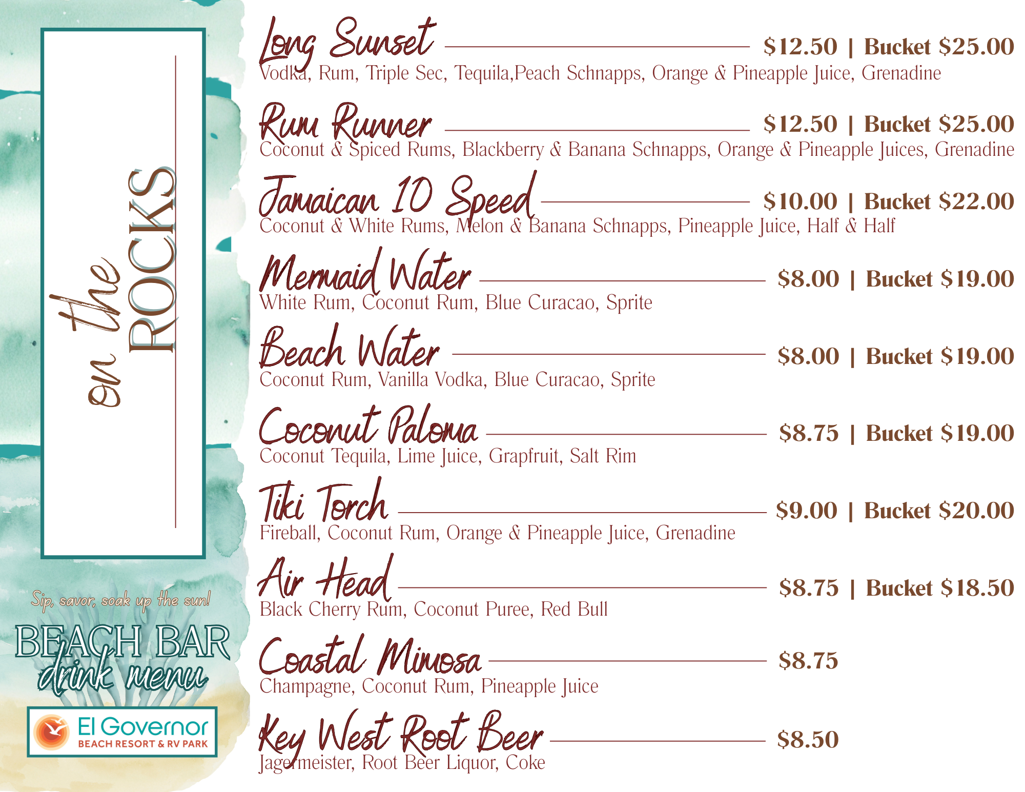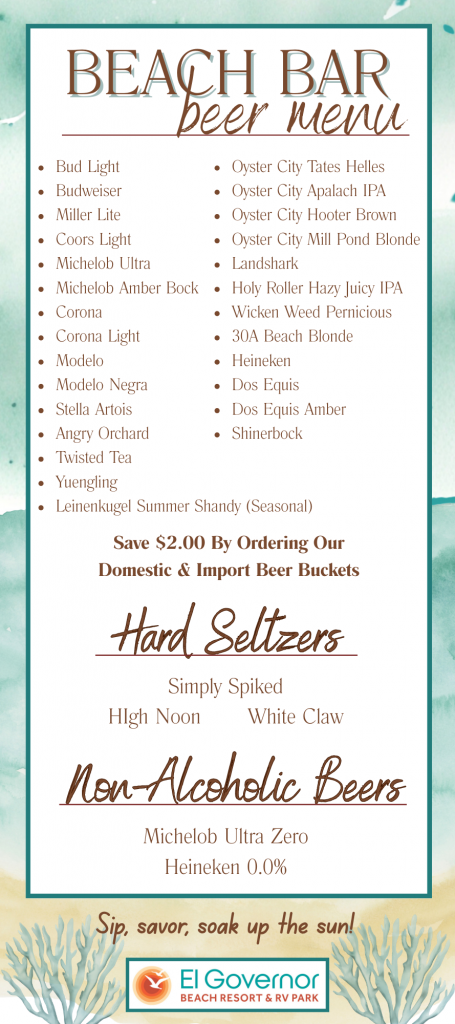 The Tiki Bar at El Governor is located right next to our heated pool and overlooking the beach. We offer a full bar and a great place to watch a game on our flat screen TV’s.